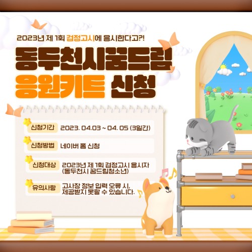 µ¿µÎõ½ÃÇб³¹Ûû¼Ò³âÁö¿ø¼¾ÅÍ(¼¾ÅÍÀå Ȳ»ó¿¬)´Â 2023³â Á¦1ȸ °ËÁ¤°í½Ã¿¡ ÀÀ½ÃÇÏ´Â Çб³ ¹Û û¼Ò³â¿¡°Ô ÇÕ°ÝÀ» ±â¿øÇÏ´Â ÀÀ¿ø ŰƮ¸¦ Áö¿øÇÑ´Ù°í ¹àÇû´Ù.