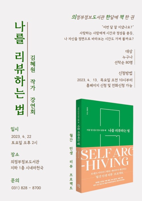ÀÇÁ¤ºÎ½Ã(½ÃÀå ±èµ¿±Ù) Á¤º¸µµ¼°üÀº 2023³â 4¿ù ÀÏ¹ÝºÐ¾ß ÀǵµÇÑ Ã¥À¸·Î ±èÇý¿ø ÀÛ°¡ÀÇ <³ª¸¦ ¸®ºäÇÏ´Â ¹ý>À» ¼±Á¤ÇØ, 4¿ù 22ÀÏ ¿ÀÈÄ 2½Ã ÀÇÁ¤ºÎÁ¤º¸µµ¼°ü¿¡¼ ±èÇý¿ø ÀÛ°¡ ÀúÀÚ°¿¬È¸¸¦ ÁøÇàÇÑ´Ù.