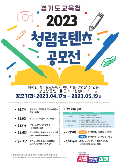 Âü°¡ ½ÅûÀº 4¿ù 17ÀϺÎÅÍ 5¿ù 19ÀϱîÁö Âü°¡½Åû¼¿Í °ø¸ðÀÛǰ ÆÄÀÏÀ» ´ã´çÀÚ À̸ÞÀÏ(goeclean@korea.kr)·Î Á¦ÃâÇÏ¸é µÈ´Ù. °ø¸ðÀü °ü·Ã ÀÚ¼¼ÇÑ »çÇ×Àº µµ±³À°Ã» ´©¸®Áý¿¡¼ È®ÀÎÇÒ ¼ö ÀÖ´Ù.