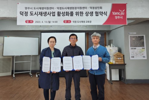 ¾çÁֽà µµ½ÃÀç»ýÁö¿ø¼¾ÅÍ¿Í ´öÁ¤ µµ½ÃÀç»ýÇöÀåÁö¿ø¼¾ÅÍ´Â Áö³ 10ÀÏ ´öÁ¤ µµ½ÃÀç»ý Ȱ¼ºÈ Áö¿ª »óÀηÁֹΰú »ó»ýÇÏ´Â µµ½ÃÀç»ý°øµ¿Ã¼ ±â¹Ý Á¶¼º°ú Áö¿ª »ó±ÇȰ¼ºÈ¸¦ À§ÇØ ´öÁ¤»óÀÎȸ(ȸÀå ÃÖÈ£¼º)¿Í »ó»ý Çù¾àÀ» ü°áÇß´Ù.