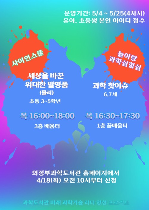 ÀÇÁ¤ºÎ½Ã(½ÃÀå ±èµ¿±Ù) °úÇеµ¼°üÀº ‘¹Ì·¡ °úÇбâ¼ú ¸®´õ ¾ç¼º ÇÁ·ÎÁ§Æ®(5¿ù)’·Î Ãʵî 3~5ÇгâÀ» ´ë»óÀ¸·Î ÇÑ '»çÀ̾ð½ºÄð'°ú 6~7¼¼ À¯¾Æ¸¦ ´ë»óÀ¸·Î ÇÑ '³îÀ̶û °úÇнÇÇè½Ç'À» ¿î¿µÇÑ´Ù.