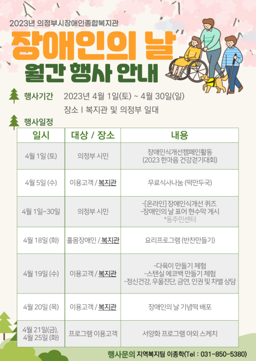 ÀÇÁ¤ºÎ½ÃÀå¾ÖÀÎÁ¾ÇÕº¹Áö°ü(°üÀå °û»ó±¸)Àº 4¿ù 20ÀÏ Àå¾ÖÀÎÀÇ ³¯À» ¸ÂÀÌÇÏ¿© 4¿ù ÇÑ´Þµ¿¾È Àå¾ÖÀνݳ¼± ¿ù°£Çà»ç‘ÇÔ²² ¿¾î¿ä, ¾î¿ï¸² ¼¼»ó!’À» ÁøÇàÇϰí ÀÖ´Ù.