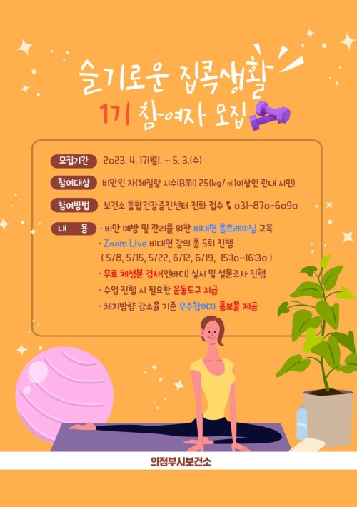 ÀÇÁ¤ºÎ½Ã º¸°Ç¼Ò(¼ÒÀå À忬±¹)´Â üÁú·® Áö¼ö(BMI)°¡ 25 ÀÌ»óÀÎ °úüÁß È¤Àº ºñ¸¸ÀÎ °ü³» ½Ã¹ÎÀ» ´ë»óÀ¸·Î 5¿ù 3ÀϱîÁö ºñ´ë¸é ¿îµ¿ °Á ‘2023 ½½±â·Î¿î ÁýÄÛ»ýȰ’ 1±â Âü¿©ÀÚ¸¦ ¸ðÁýÇÑ´Ù.
