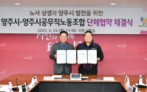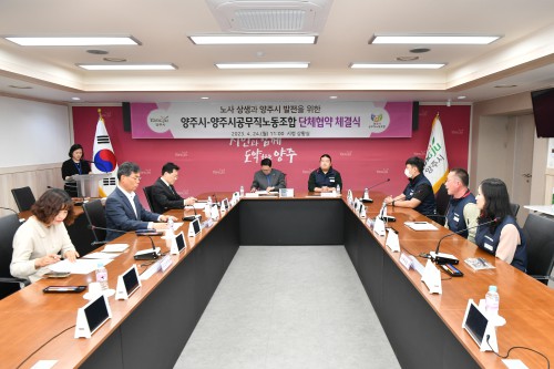 ¾çÁÖ½Ã(½ÃÀå °¼öÇö)´Â 24ÀÏ ½Ãû »óȲ½Ç¿¡¼ ¾çÁֽðø¹«Á÷³ëµ¿Á¶ÇÕ(À§¿øÀå ¼Û¿ëÀÎ)°ú ±³¼· ÃßÁø 7°³¿ù ¸¸¿¡ ´ÜüÇù¾àÀ» ü°áÇß´Ù°í ¹àÇû´Ù.