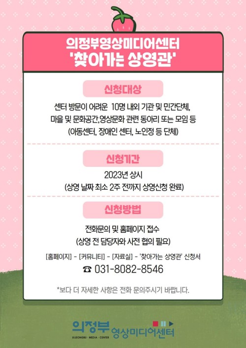 ½ÅûÀº »ó½Ã ¹Þ°í ÀÖ°í ÀÖÀ¸¸ç ÇÑ ´Þ¿¡ 1ÆÀ ¼±Âø¼øÀ¸·Î ¿î¿µÀ» ÇÑ´Ù. ȨÆäÀÌÁö¿¡¼ ½Åû¼¸¦ ´Ù¿î¹Þ¾Æ À̸ÞÀÏ(www.uimedia.or.kr)·Î Á¢¼ö ¶Ç´Â ÀüÈ Á¢¼ö°¡ °¡´ÉÇÏ´Ù. ½ÅûÀº »ó¿µ ³¯Â¥ ÃÖ¼Ò 2ÁÖ Àü±îÁö ½ÅûÇÏ¸é µÈ´Ù. Á¢¼öµÈ ½Åû¼´Â ´ã´çÀÚ¿Í »çÀü ÇùÀǸ¦ ÅëÇØ ¿î¿µµÇ°í ÀÖ´Ù. ÀÚ¼¼ÇÑ »çÇ×Àº ȨÆäÀÌÁö¿Í ÀüÈ ¹®ÀǸ¦ ÅëÇØ È®ÀÎ ÇÒ ¼ö ÀÖ´Ù.