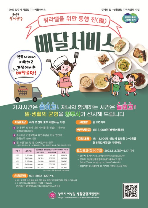 ¸ðÁýÀοøÀº ¹Ø¹ÝÂù ¹è´Þ¼ºñ½º 150°¡±¸, °¡»çµµ¿ì¹Ì ÆÄ°ßÀº 100°¡±¸ÀÌ¸ç ´ë»óÀº °ü³» °ÅÁÖ ¸¸ 18¼¼ ÀÌÇÏ Àڳฦ µÐ ¸Â¹úÀÌ ¹× ÇѺθð ¿öÅ·¸¾(´ëµð) °¡Á¤À¸·Î ¼Òµæ ±âÁØ ÁßÀ§¼Òµæ 150% ÀÌÇÏ, ¿ù 15ÀÏ ÀÌ»ó ¹× 120½Ã°£ ÀÌ»ó ±Ù¹«ÀÚ¶ó¸é ½Åû °¡´ÉÇÏ´Ù.
