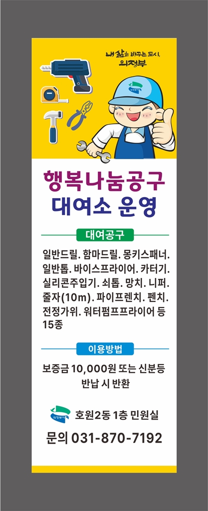 ÀÇÁ¤ºÎ½Ã È£¿ø2µ¿ ÀÚÄ¡¹Î¿ø°ú(°úÀå À±µ¿µÎ)´Â ÀÏ¹Ý °¡Á¤¿¡¼ ±¸ºñÇϱ⠾î·Á¿î »ýȰ°ø±¸ 15Á¾À» ¹«»óÀ¸·Î ´ë¿©ÇØÁÖ´Â ‘Çູ³ª´®°ø±¸ ´ë¿©»ç¾÷’ ¼ºñ½º¸¦ ½ÃÇàÇϰí ÀÖ´Ù°í 1ÀÏ ¹àÇû´Ù.