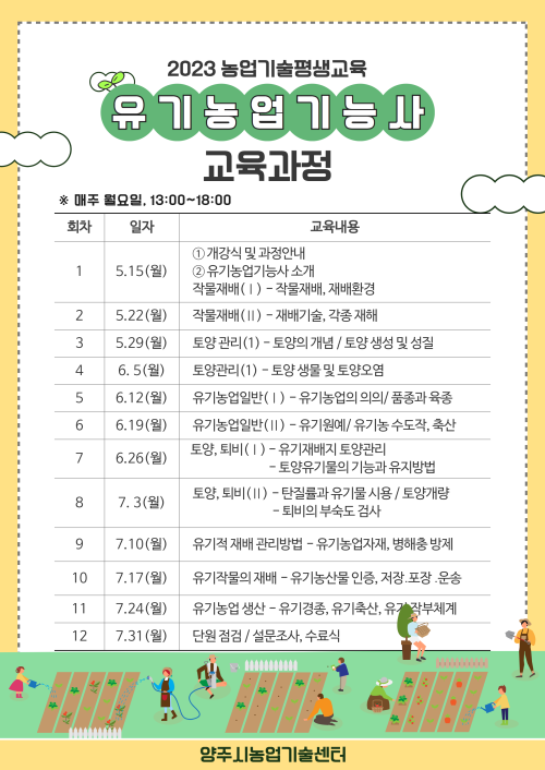 ±³À°³»¿ëÀº ±¹°¡±â¼ú ÀÚ°ÝÃëµæ °úÁ¤ÀÎ À¯±â³ó¾÷±â´É»ç Á¦3ȸ, Á¦4ȸ ÇÕ°ÝÀ» ¸ñÇ¥·Î 1Â÷ Çʱâ(ÀÛ¹°Àç¹è, Åä¾ç°ü¸®, À¯±â³ó¾÷ÀϹÝ) ¹× 2Â÷ ÇÊ´äÇüÀ» ÁßÁ¡À¸·Î ¹è¿ì°Ô µÈ´Ù.