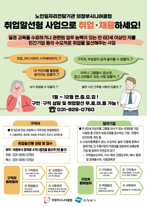 ´ëÇѺұ³Á¶°èÁ¾»çȸº¹ÁöÀç´Ü¿¡¼ À§Å¹·¿î¿µÇÏ´Â ÀÇÁ¤ºÎ½Ã´Ï¾îŬ·´(°üÀå ÃÖÀçÇõ) ½Ã´Ï¾îÃë¾÷¾Ë¼±¼¾ÅÍ¿¡¼´Â ¸¸ 60¼¼ ÀÌ»óÀÎ ÀÚ¸¦ °í¿ëÇÒ Àǻ簡 ÀÖ´Â ±¸ÀÎó ¹× ¸¸ 60¼¼ ÀÌ»ó ±¸Á÷ÀÚ¸¦ ¸ðÁýÇϰí ÀÖ´Ù.