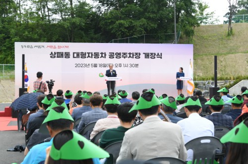 µ¿µÎõ½Ã(½ÃÀå ¹ÚÇü´ö)°¡ ȹ°Â÷ ÁÖÂ÷³ ÇØ¼Ò¿Í ¾ÈÀüÇϰí ÄèÀûÇÑ ÁÖÂ÷ȯ°æÀ» À§ÇØ »óÆÐµ¿¿¡ Á¶¼ºÇÑ ´ëÇüÀÚµ¿Â÷ °ø¿µÁÖÂ÷Àå °³Àå½ÄÀ» °®°í º»°ÝÀûÀÎ ¿î¿µ¿¡ µé¾î°¬´Ù.