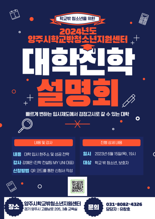 À̹ø ¼³¸íȸ´Â Çб³ ¹Û û¼Ò³â Àü¹® Áø·Î ÁøÇÐ ÄÁ¼³ÅÏÆ®ÀÎ °¿¹Àº MY UNI ´ëÇ¥¸¦ ÃʺùÇØ °ËÁ¤°í½Ã ÀÌÈÄ ´ëÇÐÀԽø¦ Áغñ ÁßÀÎ ¾çÁֽà Çб³ ¹Û û¼Ò³âµé¿¡°Ô ÇÊ¿äÇÑ ´ëÀÔ ¼º°ø Àü·« ¹× ÀüÇü ºÐ¼® µî ´Ù¾çÇÑ ´ëÀÔ °ü·Ã Á¤º¸¸¦ Á¦°øÇÒ ¿¹Á¤À¸·Î 2024Çг⵵ ´ëÀÔÀ» ÁغñÇÏ´Â ¾çÁֽà Çб³ ¹Û û¼Ò³â°ú º¸È£ÀÚ¶ó¸é ´©±¸³ª Âü¿©ÇÒ ¼ö ÀÖ´Ù.