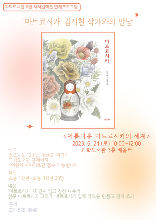 À̹ø ÇÁ·Î±×·¥Àº °úÇеµ¼°üÀÇ 6¿ù »ç¼Ä÷º¼Ç ÁÖÁ¦ÀÎ ‘Áö±Ý ¹®ÇÐÀº’ÀÇ ¿¬°èÇÁ·Î±×·¥ÀÌ´Ù. ¸¶Æ®·á½ÃÄ«¸¦ ³¶µ¶Çϰí Ã¥¿¡ ´ëÇØ °¨»óÇØ º¸°í, Ä£±¸ ¸¶Æ®·á½ÃÄ« ±×¸®±â, ¸¶Æ®·á½ÃÄ« ÀÔüīµå ¸¸µé°í ÆíÁö¾²±â µîÀÇ Ã¼Çè Ȱµ¿µµ ÁøÇàÇÒ ¿¹Á¤ÀÌ´Ù.