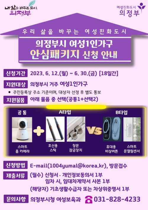 ÀÇÁ¤ºÎ½Ã(½ÃÀå ±èµ¿±Ù)´Â ¿©¼º 1Àΰ¡±¸ÀÇ ¹üÁË ¿¹¹æ ¹× ¾ÈÀüÇÑ »ýȰȯ°æ Á¶¼ºÀ» À§ÇØ ‘¿©¼º 1Àΰ¡±¸ ¾È½ÉÆÐŰÁö Áö¿ø ´ë»óÀÚ’¸¦ 6¿ù 30ÀϱîÁö ¸ðÁýÇÑ´Ù.
