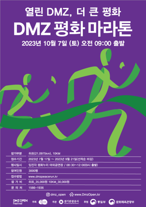 Âü°¡ ½ÅûÀº 9¿ù 21ÀϱîÁö DMZ ÆòÈ ¸¶¶óÅæ ´©¸®Áý(www.dmzpeacerun.kr)¿¡¼ ¼±Âø¼ø ½ÅûÇÒ ¼ö ÀÖÀ¸¸ç, Âü°¡ºñ´Â 10km ÄÚ½º 3¸¸ ¿ø, ÇÏÇÁ ÄÚ½º 3¸¸ 5õ ¿øÀÌ´Ù. Âü°¡ÀÚ Àü¿ø¿¡°Ô´Â Èü»ö °¡¹æ°ú ½ºÆ÷Ã÷ ¾ç¸»À» Á¦°øÇÒ °èȹÀ̸ç, ¿ÏÁÖ ½Ã¿¡´Â ¸Þ´Þ°ú ±â³äǰÀ» Áö±ÞÇÒ ¿¹Á¤ÀÌ´Ù.