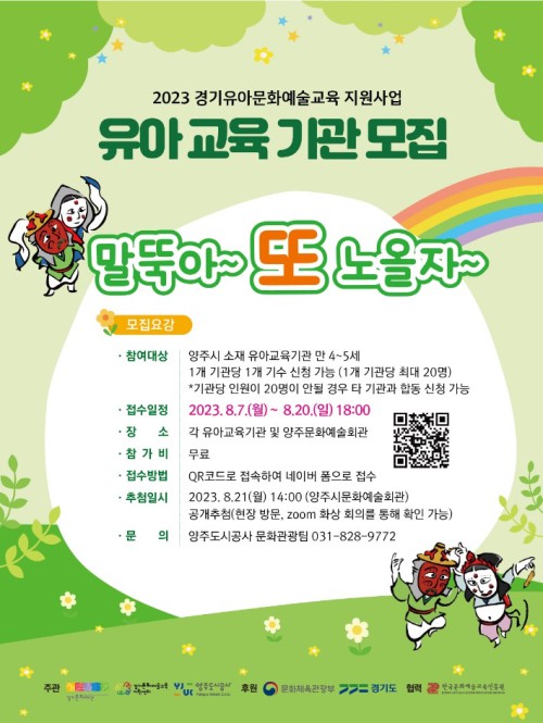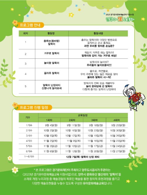 “¸»¶Ò¾Æ~ ¶Ç ³ë¿ÃÀÚ~”¹®È¿¹¼ú ±³À° ÇÁ·Î±×·¥Àº ¾çÁֽà ´ëÇ¥ ¹«Çü¹®ÈÀçÀÎ ¾çÁÖº°»ê´ë¸¦ À¯¾ÆÀÇ ´«³ôÀÌ¿¡ ¸Â°Ô À籸¼ºÇÑ ±³À° ÇÁ·Î±×·¥À¸·Î, ȹÀÏÀû ÁÖÀÔ½Ä ±³À°ÀÌ ¾Æ´Ñ À¯¾ÆµéÀÇ ÀÚÀ²¼ºÀ» ÀÎÁ¤ÇØÁÖ°í Àû±ØÀûÀÎ Âü¿©¸¦ À¯µµÇÑ´Ù.