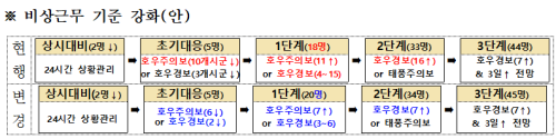 ¾Æ¿ï·¯ Àç³¾ÈÀü´ëÃ¥º»ºÎ ¿î¿µÃ¼°èµµ Áï½Ã °ÈÇß´Ù. 11°³ ½Ã±º ÀÌ»ó¿¡ È£¿ìÁÖÀǺ¸°¡ ³»¸®°Å³ª 4~15°³ ½Ã±º¿¡ È£¿ì°æº¸°¡ ³»·ÈÀ» ¶§ °¡µ¿ÇÏ´Â ºñ»ó 1´Ü°è ±âÁØÀ» 7°³ ½Ã±º È£¿ìÁÖÀǺ¸ ¶Ç´Â 3~6°³ ½Ã±º È£¿ì°æº¸ µîÀ¸·Î º¯°æÇÏ´Â µî ÀüüÀûÀÎ ºñ»ó±Ù¹«±âÁØÀ» º¯°æÇß´Ù. µµ´Â ÀÚü»óȲ½Ç ¿î¿µ°ú ºñ»ó±Ù¹«±âÁØÀ» °ÈÇÏ´Â ¹æÄ§À» ¼ö¸³·½ÃÇàÇÔÀ¸·Î½á ´Ù°¡¿Ã ÅÂdz°ú °¿ì µî ÀÚ¿¬À糿¡ ÃÑ·Â ´ëÀÀÇÒ ¼ö ÀÖ´Â ±âƲÀ» ¸¶·ÃÇß°í, ºñ»ó½Ã Àû½Ã ´ëÀÀÀ» ÅëÇØ ÇÇÇØ°¡ ÃÖ¼ÒÈÇÒ °ÍÀ¸·Î ±â´ëÇß´Ù.