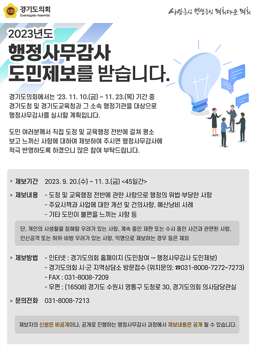 °æ±âµµÀÇȸ(ÀÇÀå ¿°Á¾Çö)´Â 2023³âµµ ÇàÁ¤»ç¹«°¨»ç(11.10.~11.23.)ÀÇ ³»½ÇÀ» ±âÇÏ°í µµ¹ÎÂü¿©¿Í ¼ÒÅëÀ» À§ÇØ 9¿ù 20ÀϺÎÅÍ 11¿ù 3ÀϱîÁö µµ¹ÎÁ¦º¸ ⱸ¸¦ ¿î¿µÇÑ´Ù.
