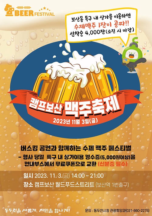 µ¿µÎõ½Ã´Â ¿À´Â 11¿ù 3ÀÏ º¸»êµ¿ °ü±¤Æ¯±¸¿¡¼ 'Ä·ÇÁº¸»ê ¸ÆÁÖÃàÁ¦'¸¦ ¿¬´Ù. ÃàÁ¦´Â ´çÀÏ ¿ÀÈÄ 2½ÃºÎÅÍ 9½Ã±îÁö À̾îÁö¸ç µ¿µÎõ ºê·ç¾î¸®¸¦ ºñ·ÔÇØ Àü±¹ °¢ÁöÀÇ ´Ù¾çÇÑ ¼öÁ¦ ¸ÆÁÖ¿Í ¿ùµåǪµå ½ºÆ®¸®Æ® À½½ÄÀ» Áñ±æ ¼ö ÀÖ´Ù.