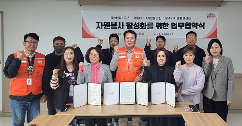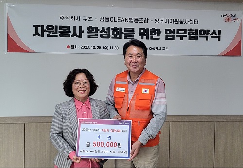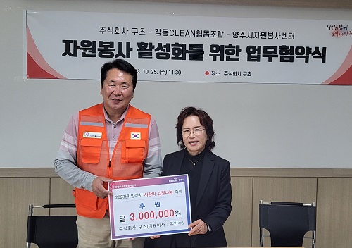 »ç)¾çÁÖ½ÃÀÚ¿øºÀ»ç¼¾ÅÍ(ÀÌ»çÀå °¼öÇö)´Â Áö³ 25ÀÏ, ÁÖ½Äȸ»ç ±¸Ã÷(´ëÇ¥ÀÌ»ç À¯Àμö), °¨µ¿CLEANÇùµ¿Á¶ÇÕ(ÀÌ»çÀå ÃÖ¸í¼÷) µî °ü³» ±â¾÷°ú ÀÚ¿øºÀ»ç Ȱ¼ºÈ¸¦ À§ÇÑ ¾÷¹«Çù¾àÀ» ÁÖ½Äȸ»ç ±¸Ã÷ ³» Ä«Æä¿¡¼ ü°áÇß´Ù°í ¹àÇû´Ù.