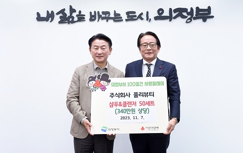 ÀÇÁ¤ºÎ½Ã(½ÃÀå ±èµ¿±Ù)´Â 11¿ù 7ÀÏ ÁÖ½Äȸ»ç Ç®¸®ºäƼ(´ëÇ¥ À̰èÁø)°¡ ‘100Àϰ£ »ç¶û¸±·¹ÀÌ ¹èÅÏ Àձ⒠ⱸ¿¡ Å»¸ð¼¤Çª ¹× ½ºÅ²Äɾî Ŭ·»Àú 50¼¼Æ®(340¸¸ ¿ø »ó´ç)¸¦ ±âºÎÇß´Ù°í ¹àÇû´Ù.
