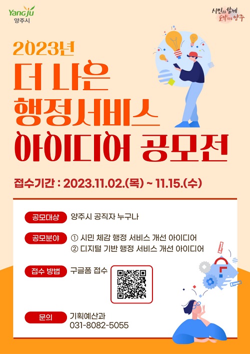 ¾çÁÖ½Ã(½ÃÀå °¼öÇö)´Â ¿½ÉÈ÷ ÀÏÇÏ´Â °øÁ÷»çȸ Á¤¸³ÀÇ ÀÏȯÀ¸·Î ¾çÁֽà °øÁ÷ÀÚ¸¦ ´ë»óÀ¸·Î ‘´õ ³ªÀº ÇàÁ¤ ¼ºñ½º’ ¾ÆÀ̵ð¾î °ø¸ðÀüÀ» ¿À´Â 15ÀϱîÁö ÃßÁøÇÑ´Ù°í ¹àÇû´Ù.