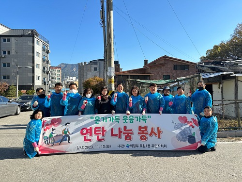 ÀÇÁ¤ºÎ½Ã È£¿ø1µ¿Áֹμ¾ÅÍ(µ¿Àå °í¿¬Èñ)´Â 11¿ù 13ÀÏ È£¿ø1µ¿ ÁÖ¹ÎÀÚġȸ(ȸÀå À̰æÀç)°¡ ¼Ò¿Ü°èÃþ 4°¡±¸¸¦ ´ë»óÀ¸·Î ‘¿Â±â°¡µæ ¿ôÀ½°¡µæ ¿¬Åº ³ª´® ºÀ»ç’¸¦ ÁøÇàÇß´Ù°í ¹àÇû´Ù.