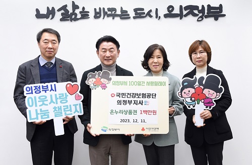 ÀÇÁ¤ºÎ½Ã(½ÃÀå ±èµ¿±Ù)´Â 12¿ù 11ÀÏ ±¹¹Î°Ç°º¸Çè°ø´Ü ÀÇÁ¤ºÎÁö»ç(Áö»çÀå ÁøÀ±Èñ)°¡ ‘100Àϰ£ »ç¶û¸±·¹ÀÌ ¹èÅÏ ÀձⒿ¡ µ¿ÂüÇØ Àú¼Òµæ°¡±¸¸¦ À§ÇÑ ¿Â´©¸® »óǰ±Ç 100¸¸ ¿øÀ» Àü´ÞÇß´Ù°í ¹àÇû´Ù.