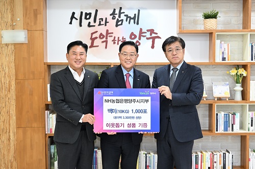 ¾çÁÖ½Ã(½ÃÀå °¼öÇö)´Â Áö³ 14ÀÏ ³óÇùÀºÇà ¾çÁÖ½ÃÁöºÎ(ÁöºÎÀå ¿ÀÁ¤¼ö)¿¡¼ ½ÃûÀ» ¹æ¹®ÇØ ¾çÁֽà ¾î·Á¿î ÀÌ¿ôÀ» µ½±â À§ÇØ ¹é¹Ì(10kg) 1,000Æ÷(ȯ°¡¾× 3,300¸¸¿ø)¸¦ ±âºÎÇß´Ù°í ¹àÇû´Ù.