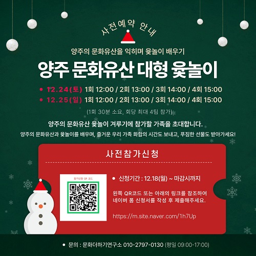 ¾çÁÖ½Ã(½ÃÀå °¼öÇö)´Â ¿À´Â 24ÀϺÎÅÍ 25ÀϱîÁö ¾çÀϰ£ ÀüÅë ³îÀÌ ¹®È°ø°£ ‘¿ì¸®³îÀÌÅÍ ¾çÁÖ’¿¡¼ ¾çÁֽø³È¸¾Ï»çÁö¹Ú¹°°ü°ú ¢ß¹®È´õÇϱ⿬±¸¼Ò°¡ ÇÔ²² ÁÖ°üÇÏ´Â ‘Å©¸®½º¸¶½º Ưº°ÇÁ·Î±×·¥’À» ÁøÇàÇÑ´Ù.