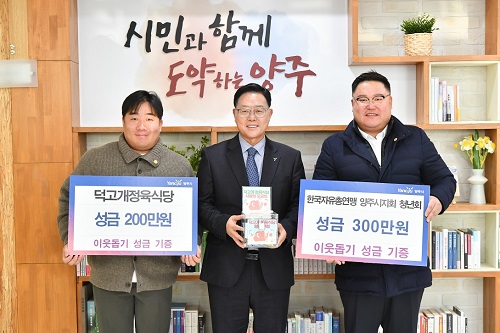 °¼öÇö ¾çÁÖ½ÃÀåÀº “³ª´®ÀÇ ¸¶À½À» Àü´ÞÇØÁֽŠÇѱ¹ÀÚÀ¯ÃÑ¿¬¸Í ¾çÁÖ½ÃÁöȸ û³âȸ ȸ¿øºÐµé²² °¨»çµå¸°´Ù”¸ç “¾çÁÖ½ÃÀÇ ¾î·Á¿òÀ» °Þ´Â ¸¹Àº ÀÌ¿ôµé¿¡°Ô Å« ÈûÀÌ µÇµµ·Ï ¶æ±í°Ô Àß Àü´ÞÇϰڴٔ¶ó°í ÀüÇß´Ù.
