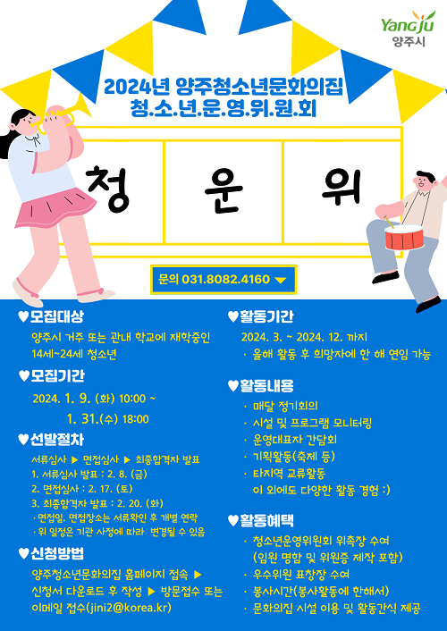 ¾çÁÖ½Ã(½ÃÀå °¼öÇö)´Â ¿À´Â 31ÀϱîÁö ¾çÁÖû¼Ò³â¹®ÈÀÇÁý¿¡¼ ‘2024³â û¼Ò³â¿î¿µÀ§¿øÈ¸ ½Å±ÔÀ§¿ø’À» ¸ðÁýÇÑ´Ù°í 9ÀÏ ¹àÇû´Ù.