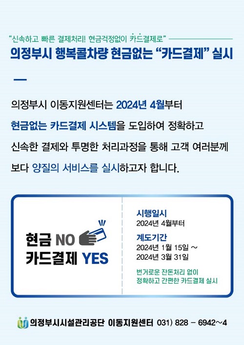 Çö±Ý¾ø´Â Ä«µå°áÁ¦ ¼ºñ½º´Â ÀÇÁ¤ºÎ½Ã À̵¿Áö¿ø¼¾ÅÍ ÇູÄÝÂ÷·® ÀÌ¿ë½Ã ¹ø°Å·Ó°í Áö¿¬µÇ´Â Çö±Ý°áÁ¦ ´ë½Å º¸´Ù Á¤È®ÇÏ°í ½Å¼ÓÇÑ Ä«µå°áÁ¦·Î ´ëüÇÔÀ¸·Î½á Åõ¸íÇÑ Ã³¸®°úÁ¤°ú °í°´µéÀÇ ÀÌ¿ëÆíÀÇ¿Í ¾çÁúÀÇ ¼ºñ½º¸¦ Á¦°øÇÑ´Ù. 2024³â »ó¹Ý±â °èµµ±â°£(1¿ù15ÀÏ ~ 3¿ù 31ÀÏ)À» °ÅÄ¡¸ç Àû±ØÀûÀÎ È«º¸¿Í ¾È³», ³»¿ë°øÀ¯¸¦ ÅëÇÏ¿© ¼ºñ½º ½Ç½Ã¿¡ È¥¼±ÀÌ ¾øµµ·Ï ÁøÇàÇÏ¸ç °èµµ±â°£ÀÌ ³¡³ª´Â 4¿ù 1ÀÏ ºÎÅÍ Çö±Ý¾ø´Â Ä«µå°áÁ¦ ½Ã½ºÅÛÀ» ½ÃÇàÇÒ ¿¹Á¤ÀÌ´Ù.
