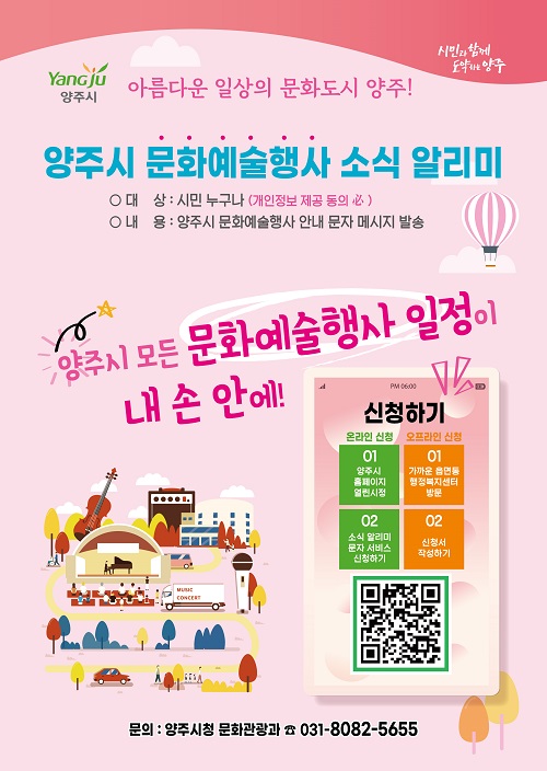 ¾çÁÖ½Ã(½ÃÀå °¼öÇö)´Â ½Ã¹Î°úÀÇ ¼ÒÅë °È¿Í ¾çÁֽùΠ¹®È ÇâÀ¯ ±âȸ º¸ÀåÀ» À§ÇØ ‘¹®È¿¹¼úÇà»ç ¼Ò½Ä ¾Ë¸®¹Ì’¼ºñ½º¸¦ °³½ÃÇß´Ù°í 22ÀÏ ¹àÇû´Ù.