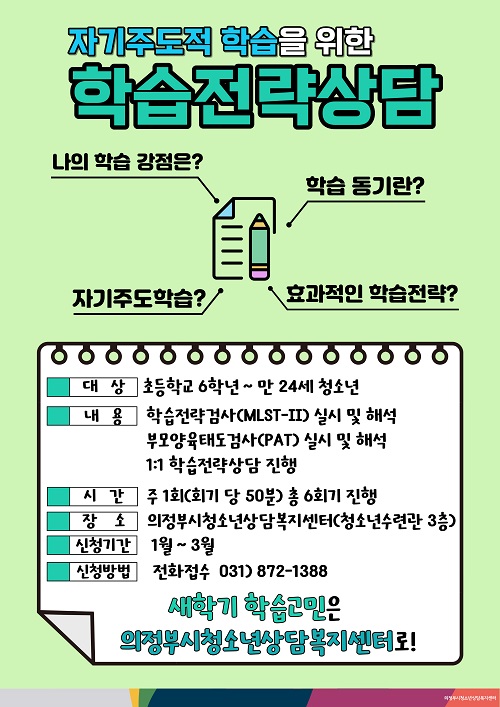 ÀÇÁ¤ºÎ½Ãû¼Ò³âÀç´Ü(´ëÇ¥ÀÌ»ç °æ±Ô°ü)¿¡¼ ¿î¿µÇÏ´Â ÀÇÁ¤ºÎ½Ãû¼Ò³â»ó´ãº¹Áö¼¾ÅÍ(¼¾ÅÍÀå ÀÌ»ó¼ø)´Â û¼Ò³âÀÇ ½ºÆ®·¹½º ÁÖ¿ä¿øÀÎ Áß ÇϳªÀÎ ÇнÀÀ¸·Î ÇнÀµ¿±â°È ¹× ÇнÀÀü·«Çâ»óÀ» µ½±â À§ÇØ ÃÊ6~¸¸24¼¼ û¼Ò³âµéÀ» ´ë»óÀ¸·Î 1¿ùºÎÅÍ 2024³â ÇнÀÀü·«»ó´ã ÇÁ·Î±×·¥À» Âü°¡ÀÚ ¸ðÁý ¹× ÁøÇà ÁßÀÌ´Ù.