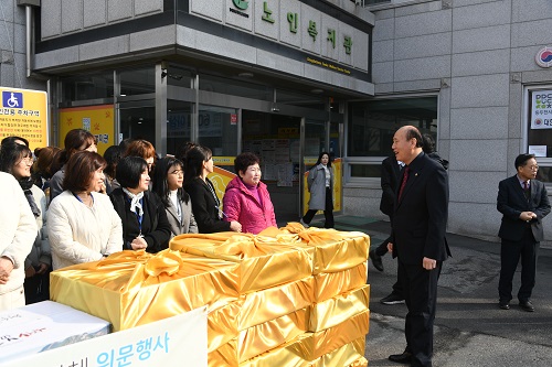 µ¿µÎõ½Ã(¹ÚÇü´ö ½ÃÀå)´Â Áö³ 2¿ù 1ÀÏ °©Áø³â ¼³³¯À» ¸ÂÀÌÇØ µ¿µÎõ½Ã °ü³» »çȸº¹Áö½Ã¼³ ¹× ´Üü 7°÷À» ¹æ¹®ÇØ À§¹®Ç°À» Àü´ÞÇß´Ù.