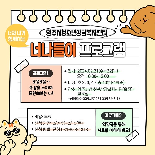 ¾çÁÖ½Ãû¼Ò³â»ó´ãº¹Áö¼¾ÅÍ(¼¾ÅÍÀå ÀÌ»óÇö)´Â ¿À´Â 7ÀϺÎÅÍ 15ÀϱîÁö °ü³» û¼Ò³âÀ» ´ë»óÀ¸·Î ‘³Ê³ªµéÀÌ(³Ê, ³ªÇÏ°í ºÎ¸£¸ç Çã¹°¾øÀÌ Áö³»´Â »çÀÌ)’ÇÁ·Î±×·¥ Âü°¡ÀÚ¸¦ ¸ðÁýÇÑ´Ù°í 5ÀÏ ¹àÇû´Ù.