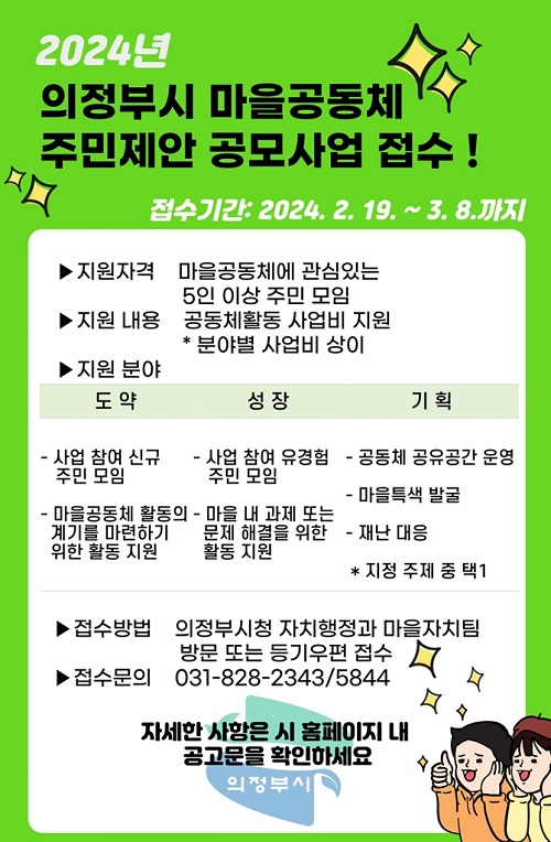 ÀÇÁ¤ºÎ½Ã(½ÃÀå ±èµ¿±Ù)´Â 2¿ù 19ÀϺÎÅÍ 3¿ù 8ÀϱîÁö ‘2024³â ¸¶À»°øµ¿Ã¼ ÁÖ¹ÎÁ¦¾È °ø¸ð»ç¾÷’À» Á¢¼öÇÑ´Ù.
