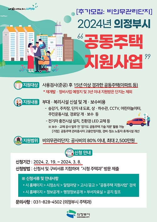 ÀÇÁ¤ºÎ½Ã(½ÃÀå ±èµ¿±Ù)´Â ³ëÈÄ °øµ¿ÁÖÅÃÀÇ °ü¸®ºñ¿ë ºÎ´ã ¿ÏÈ¿Í ÁְŠȯ°æ °³¼±À» À§ÇØ 3¿ù 8ÀϱîÁö ‘2024³â °øµ¿ÁÖÅà Áö¿ø»ç¾÷(ºñÀǹ«°ü¸®´ÜÁö)’ Ãß°¡ ¸ðÁýÀ» ¹Þ´Â´Ù.