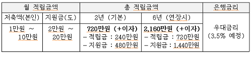û¼Ò³âÀÌ 1¸¸ ¿øÀ» ÀúÃàÇÏ¸é µµ°¡ 2¸¸ ¿øÀ», 10¸¸ ¿øÀ» ÀúÃàÇϸé 20¸¸ ¿øÀ» Ãß°¡ Àû¸³ÇÏ´Â ¹æ½ÄÀε¥ ÃÖÃÊ 2³â¾¿ ÃÖ´ë 6³â±îÁö ÀúÃàÇÒ ¼ö ÀÖ´Ù. 10¸¸ ¿ø¾¿ ÃÖ´ë 6³âÀ» ÀúÃàÇÒ °æ¿ì º»ÀÎ Àû¸³±Ý 720¸¸ ¿ø¿¡ µµ Àû¸³±Ý 1,440¸¸ ¿øÀ» ÇÕÄ£ 2,160¸¸ ¿ø¿¡ ÀÌÀÚ¸¦ Ãß°¡·Î ¹ÞÀ» ¼ö ÀÖ´Ù.