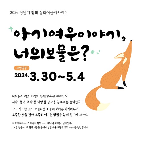 ÀÇÁ¤ºÎ¹®ÈÀç´Ü(´ëÇ¥ ¹ÚÈñ¼º)ÀÌ ¿À´Â 3.30(Åä)ºÎÅÍ Ã¢ÀÇ ¹®È¿¹¼ú¾ÆÄ«µ¥¹Ì '¾Æ±â ¿©¿ì À̾߱â, ³ÊÀÇ º¸¹°Àº?'À» ½ÃÀÛÀ¸·Î 2024³â »õ·Ó°Ô ¼±º¸ÀÌ´Â ¹®È¿¹¼ú ¾ÆÄ«µ¥¹Ì ÇÁ·Î±×·¥À» ½ÃÀÛÇÑ´Ù.