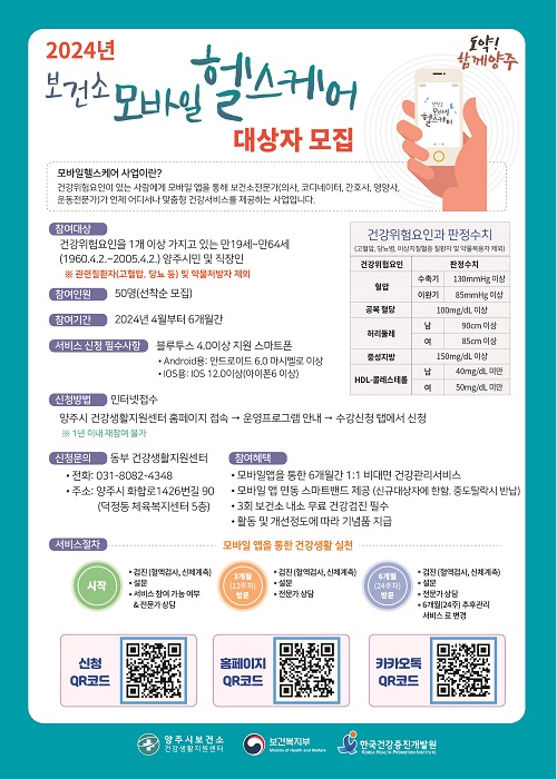 ¾çÁÖ½Ã(½ÃÀå °¼öÇö)°¡ 13ÀϺÎÅÍ ¿À´Â 22ÀϱîÁö ºñ´ë¸é °Ç°°ü¸® »ç¾÷ÀÎ ‘¸ð¹ÙÀÏ ÇコÄÉ¾î »ç¾÷’ Âü¿©ÀÚ 50¸íÀ» ¼±Âø¼ø ¸ðÁýÇÑ´Ù°í ¹àÇû´Ù.