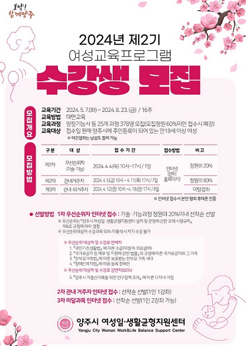 ¾çÁÖ½Ã(½ÃÀå °¼öÇö)°¡ ¿À´Â 4¿ù 4ÀϺÎÅÍ 19ÀÏ 17½Ã±îÁö ¿©¼ºÀÏ․»ýȰ±ÕÇüÁö¿ø¼¾ÅÍ¿¡¼ ÁøÇàÇÏ´Â ‘2024³â Á¦2±â ¿©¼º ±³À° ÇÁ·Î±×·¥’ ¼ö°»ýÀ» ¼±Âø¼ø ¸ðÁýÇÑ´Ù°í ¹àÇû´Ù.