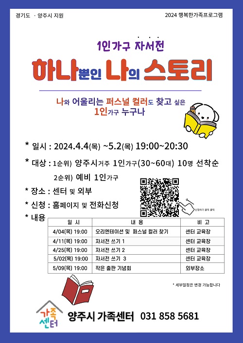 ¾çÁÖ½Ã(½ÃÀå °¼öÇö)´Â °¡Á·¼¾Å͸¦ ÅëÇØ ¿ÃÇØ 1Àΰ¡±¸ÀÇ °Ç°Çϰí ÇູÇÑ ¶óÀÌÇÁ¸¦ À§ÇØ 1Àΰ¡±¸ ÀÚ¼Àü ¾²±â ‘Çϳª»ÓÀÎ ³ªÀÇ ½ºÅ丮’ ÇÁ·Î±×·¥À» ÁøÇàÇÑ´Ù°í 18ÀÏ ¹àÇû´Ù.
