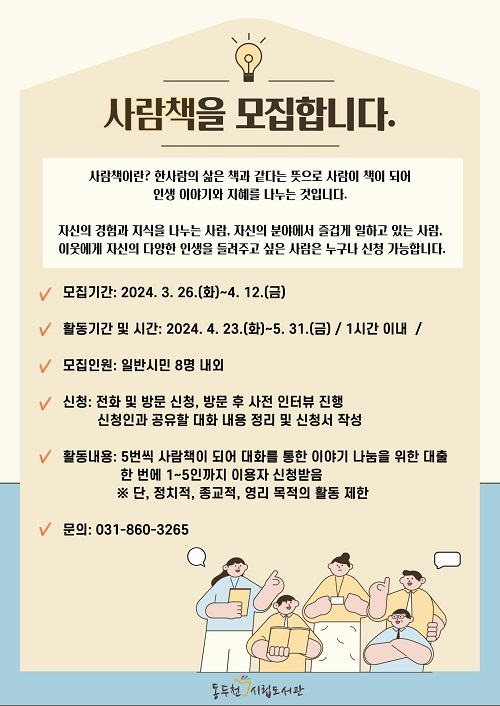 µ¿µÎõ½Ã¸³µµ¼°ü¿¡¼´Â ¸ÕÀú ÀÚ½ÅÀÇ »îÀÇ ÁöÇý¿Í °æÇèÀ» ³ª´©¾îÁÙ '»ç¶÷Ã¥'À» 8¸í ³»¿Ü·Î 3¿ù 26ÀϺÎÅÍ 4¿ù 12ÀϱîÁö ¸ðÁýÇÑ´Ù. Àç´É ³ª´®À¸·Î ¿î¿µµÇ´Â ÇÁ·Î±×·¥ÀÇ Áö¿ø ÀÚ°ÝÀº ´Ù¾çÇÑ ºÐ¾ßÀÇ °æÇè°ú Áö½ÄÀ» °®Ãá »ç¶÷ÀÌ¸é ´©±¸³ª °¡´ÉÇÏ´Ù.