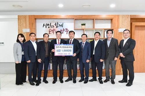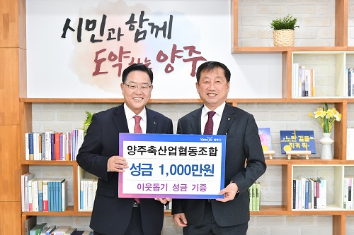 ¾çÁÖ½Ã(½ÃÀå °¼öÇö)°¡ 27ÀÏ ¿ÀÀü ¾çÁÖÃà»ê¾÷Çùµ¿Á¶ÇÕ(Á¶ÇÕÀå ÀÌÈı¤)¿¡¼ ½ÃûÀ» ¹æ¹®ÇØ °ü³» ¾î·Á¿î ÀÌ¿ôÀ» À§ÇØ ½á´Þ¶ó¸ç ¼º±Ý 1,000¸¸ ¿øÀ» ±âºÎÇß´Ù°í ¹àÇû´Ù.