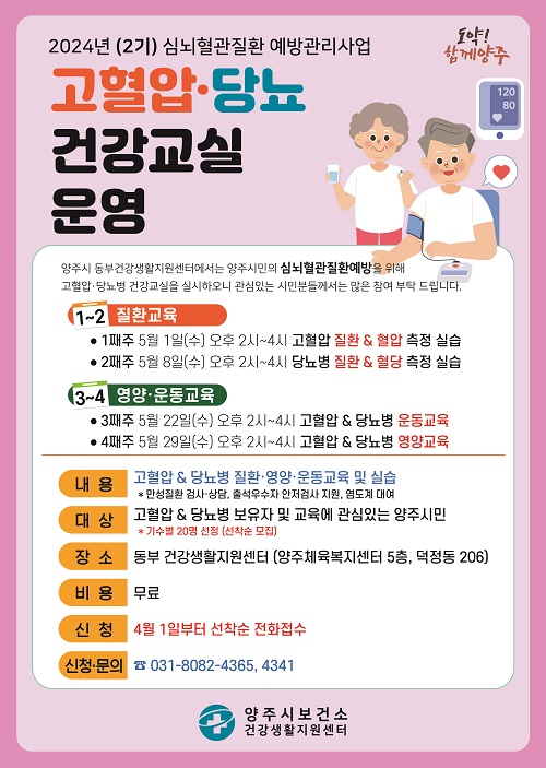 ¾çÁÖ½Ã(½ÃÀå °¼öÇö)°¡ µ¿ºÎ °Ç°»ýȰÁö¿ø¼¾ÅÍ¿¡¼ ‘2024³â 2±â °íÇ÷¾Ð·´ç´¢º´ °Ç° ±³½Ç’ ´ë»óÀÚ¸¦ ¿À´Â 4¿ù 1ÀϺÎÅÍ ¼±Âø¼ø ¸ðÁýÇÑ´Ù.