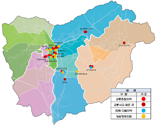 ÀÌ ¿Ü¿¡µµ ÀÇÁ¤ºÎ¿ª ÁÖº¯, ¸¸°¡´ë±³Â÷·Î, ¹ö½ºÅ͹̳ΠÀαÙ, ¼º¸ðº´¿ø±³Â÷·Î, °æÂû¼ ¾Õ µî ÁÖ¿äÃàÀÇ °áÀýÁ¡(ÅëÇà·®ÀÌ ÁýÁߵǴ ÁöÁ¡)ÀÇ °æ¿ì, À¯µ¿Àα¸¿Í ÅëÇà·®ÀÌ °¡Àå ÁýÁߵǴ ÷µÎ½Ã°£¿¡ È¥Àâ°ú Á¤Ã¼, »ç°í¿Í ¹Î¿øÀÌ ÁÖ·Î ¹ß»ýÇÏ´Â °ÍÀ¸·Î Á¶»çµÆ´Ù.