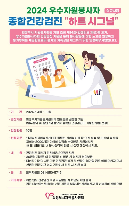 ÀÇÁ¤ºÎ½ÃÀÚ¿øºÀ»ç¼¾ÅÍ(ÀÌ»çÀå ÀÌ¿ë°É)´Â 2024³â ¿ÃÇØ ÀÇÁ¤ºÎ½Ã ¿ì¼öÀÚ¿øºÀ»çÀÚ¸¦ ´ë»óÀ¸·Î °Ç°ÇÑ ÀÚ¿øºÀ»ç Ȱµ¿ ¿µÀ§¸¦ À§ÇØ ¿ì¼öÀÚ¿øºÀ»çÀÚ °Ç°°ËÁø ÇÁ·Î±×·¥ ‘ÇÏÆ® ½Ã±×³Î’À» ÁøÇàÇϰí ÀÖ´Ù.