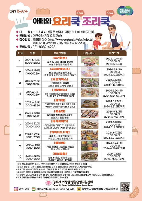 ¾çÁÖ½Ã(½ÃÀå °¼öÇö)°¡ ¿À´Â 29ÀϺÎÅÍ ¾çÁֽÿ©¼ºÀÏ‧»ýȰ±ÕÇüÁö¿ø¼¾ÅÍ¿¡¼ ¾Æºü¿Í Àڳడ ÇÔ²²ÇÏ´Â ¿ä¸® ±³½Ç ‘¾Æºü¿Í ¿ä¸®ÄîÁ¶¸®Äî’¿¡ Âü¿©ÇÒ Á÷ÀåÀÎ ¾Æºü¿Í Àڳฦ ¸ðÁýÇÑ´Ù.