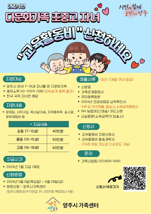 ‘´Ù¹®È°¡Á· ÀÚ³à ±³À°È°µ¿ºñ Áö¿ø»ç¾÷’Àº ´Ù¹®È °¡Á¤ÀÇ ÀÚ³àµéÀÌ Çб³»ýȰ°ú ±³À°¿¡ ÇÊ¿äÇÑ ±³À°È°µ¿ºñ¸¦ Áö¿ø¹Þ¾Æ ¾ÆÀ̵éÀÌ ´õ ÁÁÀº ÇнÀ ȯ°æ¿¡¼ °øºÎÇÒ ¼ö ÀÖµµ·Ï Áö¿øÇÏ´Â °ÍÀ¸·Î »ç¾÷ÃßÁøÀº ¾çÁֽà °¡Á·Áö¿ø»ç¾÷ À§Å¹±â°üÀÎ ¾çÁֽð¡Á·¼¾ÅÍ¿¡¼ ÃßÁøÇÑ´Ù.